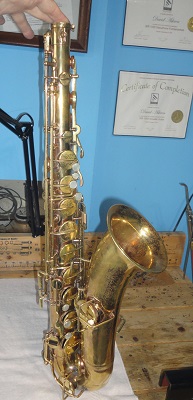 This Selmer tenor saxophone shows the damage that can occur to a horn when a gig bag is used instead of a hard shell case. It also needed a full overhaul.